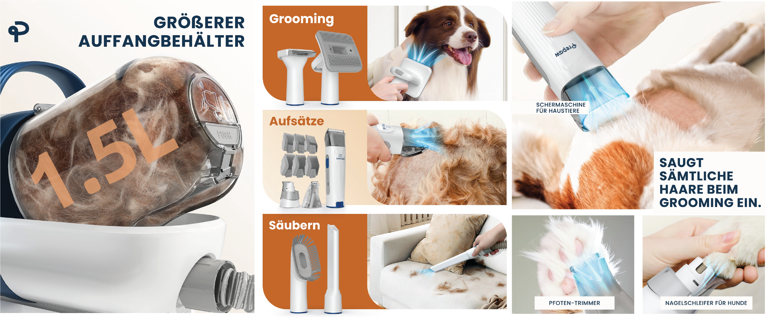 Es ist das erste Grooming-Tool seiner Art auf dem deutschen Markt: Ein smarter Multifunktions-Haustiersauger mit unterschiedlichen Werkzeugen für verschiedene Anlässe. Das perfekte Geschenk für jeden Haustierbesitzer.